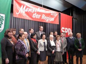 Hagenbach, 15. Januar 2012. Norbert Kuntz von der Initiative Südpfalz-Energie, Erni Wölfle, Christa Kämpfe, Rosemarie Ullrich und Ok-Young You von der Krebshilfe der Verbandsgemeinde Hagenbach, der „Grenzgänger Gottes“ Gilbert Greiner mit seinen grenzüberschreitenden Mitstreitern Angela Fabian und Heiko Schwarz, Erich Gehrlein, der nach dem Tsunami nach Japan flog um den Menschen dort zu helfen – sie sind die „Menschen der Region 2011“.