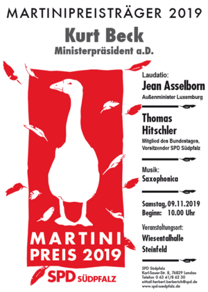 Den traditionellen Martinipreis der südpfälzischen SPD erhält in diesem Jahr der frühere langjährige rheinland-pfälzische Ministerpräsident (1994-2013), ehemalige SPD-Bundesvorsitzende, amtierende Vorsitzende der Friedrich-Ebert-Stiftung und Ehrenvorsitzende der SPD Rheinland-Pfalz, Kurt Beck.