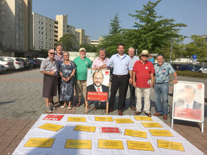 Bei schönstem Wetter haben die SPD-Senioren der Südpfalz am 26.08.2017 beim REWE-Markt in Wörth/Dorschberg den Bundestagswahlkampf eröffnet. „Was hann dann ihr do scheenes“, sagte eine ältere Passantin, die vom einkaufen kam und auf die Bodenzeitung aufmerksam wurde.